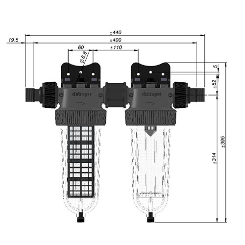 Cintropur Filtergehäuse NW 25 DUO - CTN 3/4 Zoll + 1 Zoll Außengewinde Filtertyp: NW25 DUO-CTN Anschlüsse: ¾ ” und 1” Durchfluss: 0,5 m³/h bei ?P 0,2 bar Betriebsdruck: 10 bar Max. Druck: 16 bar Max. Betriebstemperatur:50°C Gewicht: 3,2kg (3,7kg mit Verpackung) Verpackung (L x B x H):380 x 330 x 135 mm Filterkopf: Polypropylen (PP) + 20%Glasfaser (GF) Filterglocke: StyreneAcrylonitrile(SAN) Filterschlüssel: ABS O’Ringe: Nitril Butadien Rubber (NBR) Zentrifuge + Abschlussdeckel: Polyethylen (PE) Entleerungsschraube: Polyamid (PA) + Polyester (2K) Filterstützkorb: PP + 20 % GFFiltervlies:Polyester (nicht waschbar) oder Nylon (waschbar) CTN-Aktivkohlekartusche: SAN (Körper) 0,6 mm + PP mit 20% GF (Deckel) 0,3mm Filteroberfläche / Volumen: 440 cm² mit Filtervlies + 0,57 L Aktivkohle Serienmäßige Ausstattung: Filtervlies in 25 ?m, mit Aktivkohle befüllte CTN-Kartusche,1 Schlüssel, 2 Wandhalterungen ausPP + 30% GF + 2 Anschlüsse ¾’’ + 2 Anschlüsse 1’’ Optionen: Ablasskugelhahn ¼’’ Messing vernickelt, Manometer 1/8’’ Messing Sonstige verfügbare Feinheiten: Nicht waschbar: 1 -5 -10-25-50-100 ?m(Set von 5 Filtervliesen) Waschbar: 150-300 ?m |