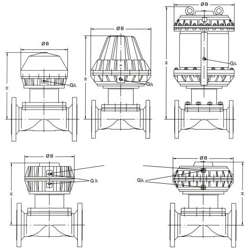 - Metall-Membranventil - Flansch EN 1092, RF, Länge EN 558-1, Reihe 1 - Metall-Stellantrieb, pneumatisch betätigt NC - Steuerluftanschluss 90° zum Durchfluss |